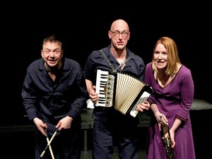 „Und, was ist mit Joschka?“ steht auf dem Bühnenboden im Kiesel, daneben Rechenaufgaben, Noten und Kinderzeichnungen. Marie-Luise Gunst, Jens Hasselmann und Dieter Hinrichs vom Theater Hof/19 aus Oldenburg entführen das Publikum im Häfler Kiesel ins fiktive „Hotel Junimond“ und checken mit „Gefahr“, einem Titel von Rio Reisers sechstem und letztem Soloalbum aus dem Jahr 1995 dort ein.