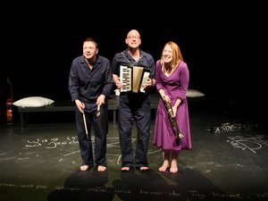 Vom bewegenden „Junimond“ wechseln sie zum düsteren und eindrücklich choreografierten „Blinden Passagier“. Gitarren, Akkordeon, Schlagzeug und E-Gitarre, Flöte, Trompete, Mandoline und Xylophon: offenbar gibt es kein Instrument, das nicht wenigstens einer der Drei beherrscht. Angewiesen sind sie nicht darauf. Auf ihren drei Betten liegend singen sie „Agitpop“ aus den 1970ern, zuerst a capella „Keine Macht für Niemand“ und im nächsten Moment möchte man sich wie Hinrichs die Ohren zuhalten, denn mit „Macht kaputt was euch kaputt macht“ legen sie kräftigen Punk vor. Gefühlvoll singt Hasselmann die Ballade „Weit, weit, weit von hier, hier vor meiner Tür, saß ein Mensch, wohl ein Kind. Kannte ich nicht das Gesicht? Ich glaub, das Kind war ich.“